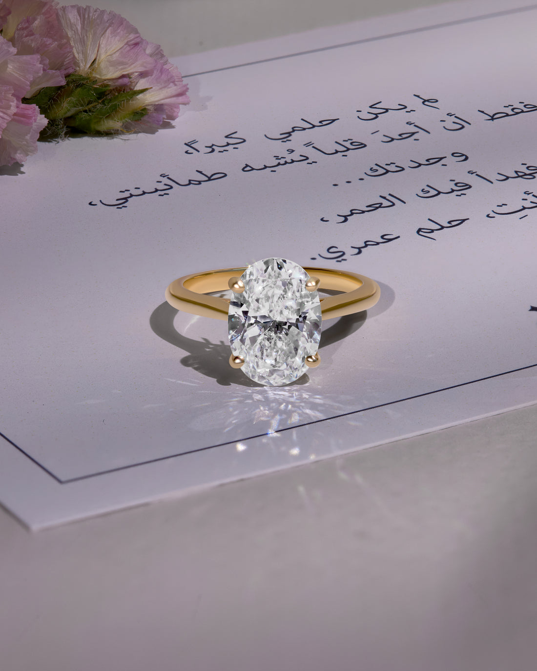 خاتم فاخر بقصّة بيضاوية (برليانت) , إشراقة أنثوية بلمسة خالدةترتكز الحجر على قاعدة مرتفعة مع...